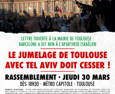Dans une lettre ouverte adressée à la mairie de Toulouse, trente organisations toulousaines demandent à ce que la ville rose suive la voie de la mairie de Barcelone et mette fin à son jumelage avec Tel Aviv, la capitale de l’apartheid israélien. Ces différentes organisations politiques, syndicats d’étudiants et de travailleurs, organisations féministes et antiracistes appellent à se rassembler le jeudi 30 mars prochain dès 18H30 au métro Capitole en soutien au peuple palestinien et pour (…)