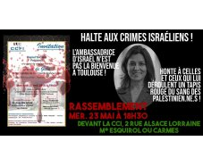 Halte aux crimes israéliens ! L’ambassadrice d’Israël n’est pas la bienvenue à Toulouse Honte à celles et ceux qui lui déroulent un tapis rouge du sang des Palestinien.ne.s