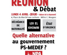 Etat d’urgence, déchéance de nationalité, lois Macron,... et maintenant loi de casse du code du travail. Ce gouvernement Hollande-Valls va au-delà de toutes les espérances du patronat dans sa politique de casse sociale, de destruction de nos acquis sociaux. Pour arriver à ses fins, il n’hésite pas à utiliser les pires méthodes : répression anti-syndicale, politiques islamophobes, (…)
