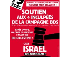 Mercredi 9 novembre, 4 militants de la campagne BDS (Boycott – Désinvestissement – Sanctions de l’Etat d’Israël) sont convoqués au tribunal de Toulouse pour « avoir entravé l’exercice normal – de 3 magasins – lors de leur activité économique » à la suite d’un dossier monté par deux organisations pro-israéliennes (dont la LICRA). Ils sont en fait poursuivis pour avoir distribué un tract sur la voie publique qui appelait au boycott des produits israéliens.