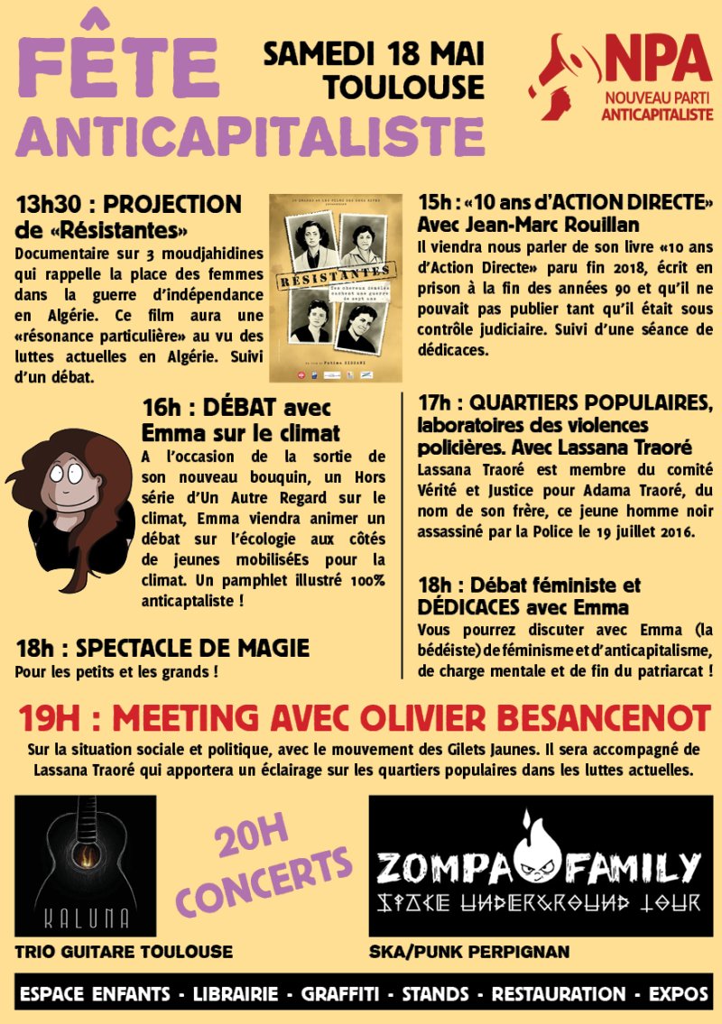 10 mai 2019L’édition 2019 de la fête anticapitaliste à Toulouse se déroulera dans le Nord de Toulouse, à proximité du quartier des Izards (métro 3 cocus) dans la salle Ernest Renan (5 chemin d’Audibert).