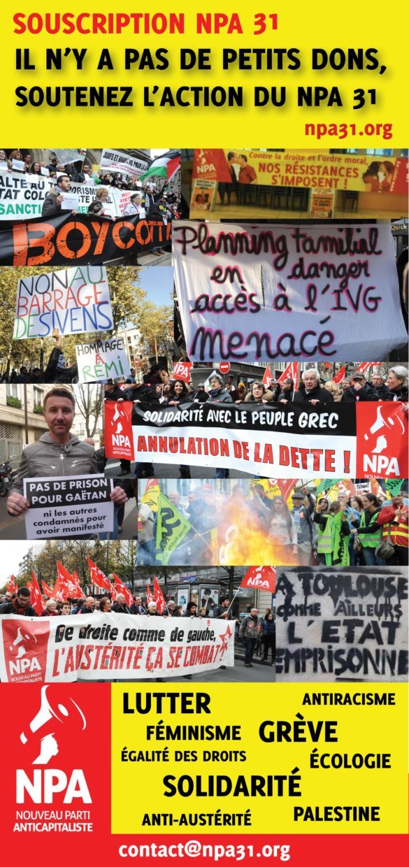 7 août 2015Le NPA 31 a besoin de vous. Nous sommes présentEs au quotidien dans les luttes sociales, écologiques, internationalistes, féministes, pour les droits des LGBT, contre la répression... Le NPA 31 joue un rôle à part entière sur la scène politique en Haute-Garonne. Palestine, Sivens, contre l’austérité,... bien souvent nous sommes à l’initiative et notre action compte dans une situation où, plus que jamais, le monde du travail, la jeunesse, les classes populaires cherchent une issue face à l’austérité et la montée de l’extrême-droite.