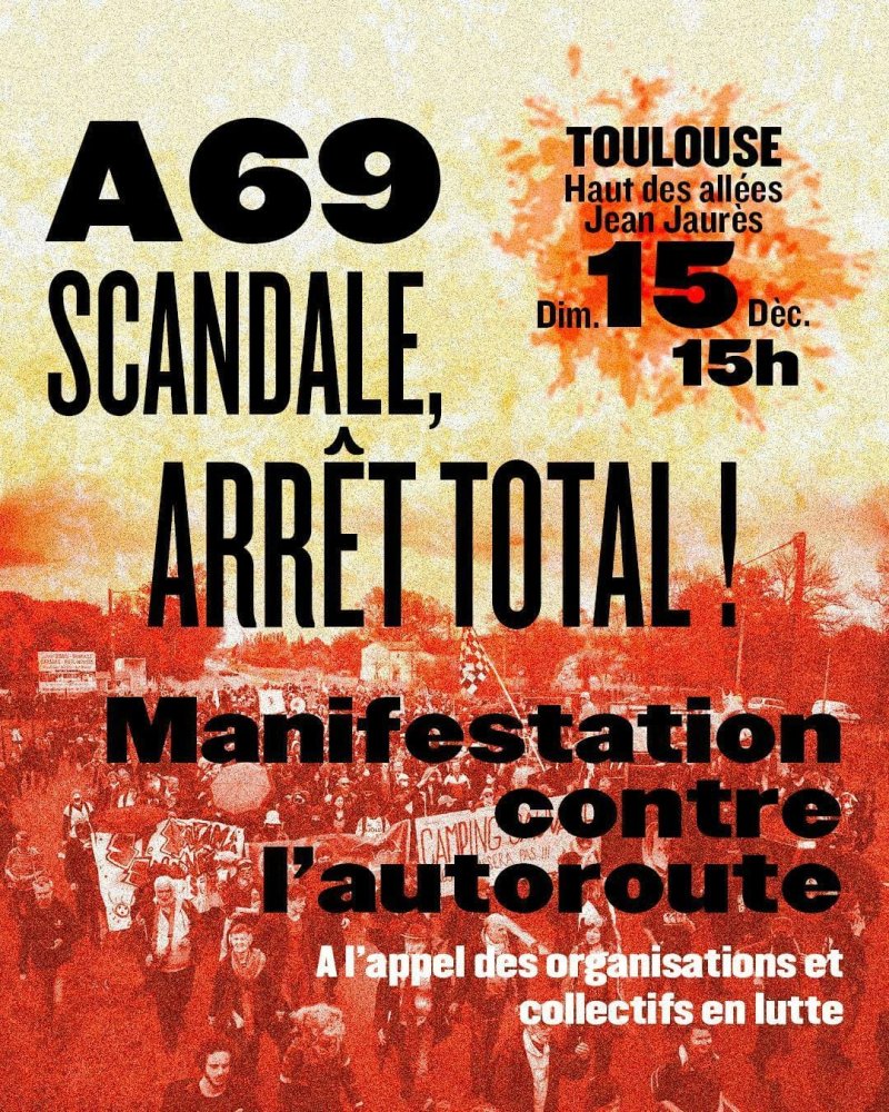 14 décembre 2024En réaction à la décision de justice inédite, le 9 décembre, de la réouverture de l’instruction judiciaire , concernant le projet A69, et afin de dénoncer le report sans date précise du jugement, ce qui laisse au chantier le temps d’aggraver ses destructions, les collectifs en lutte contre cette autoroute appellent à manifester ce dimanche 15 décembre à 15h, en haut des allées Jean Jaurès, à Toulouse afin de soutenir la demande de suspension de ce projet écocidaire.