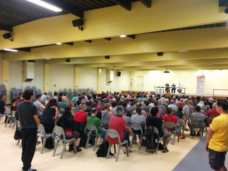 11 juin 2015Plus de 300 personnes se sont rendues au meeting organisé par l’Union Juive Française pour la Paix (UJFP) et Boycott Désinvestissement Sanctions (BDS) mardi soir salle des allées de Barcelone. Cette réunion à laquelle était invité Pierre Stambul (co-président de l’UJFP) avait pourtant été attaquée de toutes parts : d’abord par des réseaux d’extrême droite sionistes qui appelaient tout bonnement à empêcher sa tenue et ensuite par l’arrestation violente de Pierre Stambul par le RAID la nuit précédant son intervention. Il s’agit donc d’un succès du mouvement de solidarité avec le peuple palestinien. C’est sans doute pour cela que Gérard Folus président de la LICRA 31 pense qu’il est utile de taxer les organisateurs et les participants de ce meeting d’antisémites ! Quand on sait que l’organisation qui était à l’origine de sa tenue, la même que celle du principal orateur est l’Union Juive Française pour la Paix, il y aurait de quoi en rire… malheureusement cela donne plutôt envie de pleurer ! Gérard Folus déclare : « Avec un groupe d’une quarantaine de personnes, nous sommes venus exprimer notre désaccord avec ceux qui ont organisé et animé cette conférence. » Ils étaient plutôt vingt en réalité et il omet également de dire que parmi cette « quarantaine » de personnes plusieurs étaient cagoulées ou bien portaient un casque de moto. De quoi s’interroger sur leurs motivations et sur le fait que cela ne pose aucun problème au président de la LICRA de se retrouver aux côtés de militants d’extrême droite.