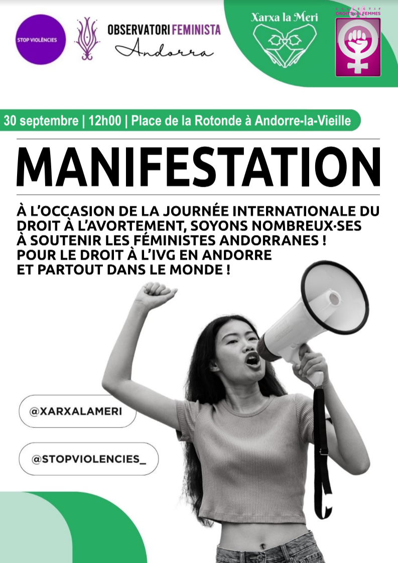 25 septembre 2023Le 30 Septembre aura lieu en Andorre une manifestation à l’appel de Stop Violences, une association féministe qui lutte pour la dépénalisation de l’avortement, considéré en Andorre, comme un crime, même après un viol. Sa présidente Vanessa Mendoza est poursuivie par les autorités de son pays pour avoir dénoncé en 2019, dans une session organisée par le comité de l’ONU contre les discriminations, l’interdiction de l’avortement dans son pays.