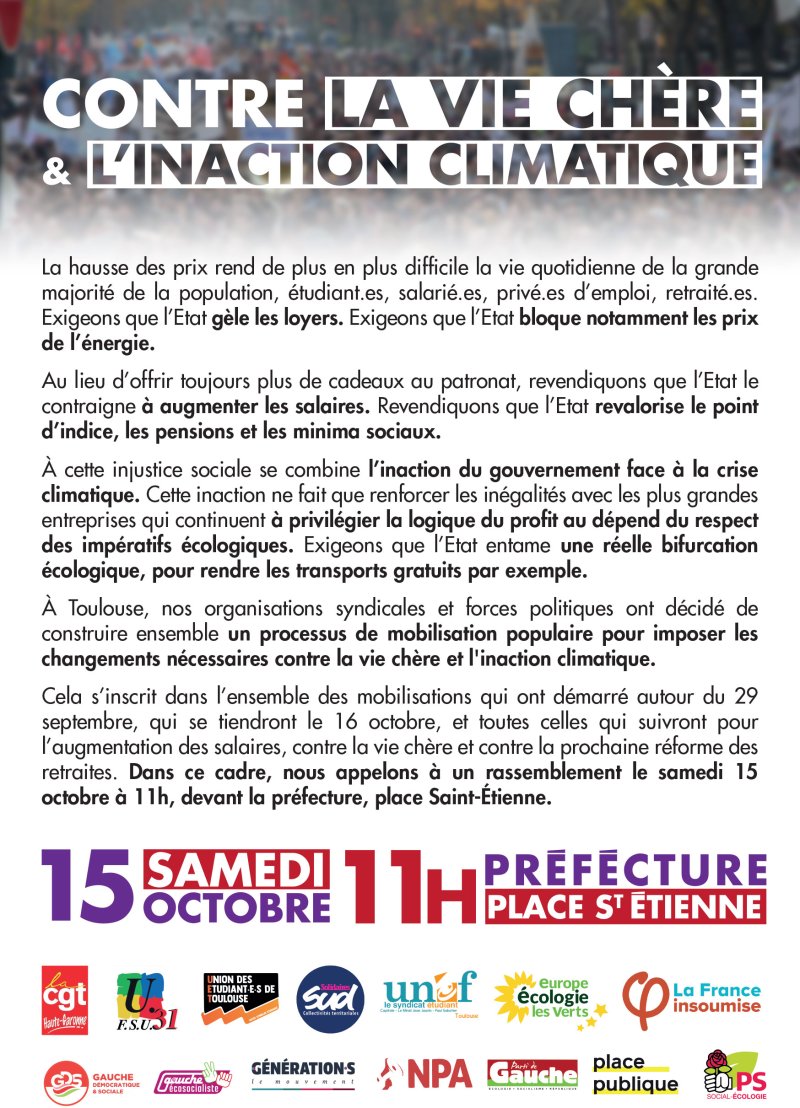 Rassemblement unitaire à Toulouse contre la vie chère et l’inaction climatique