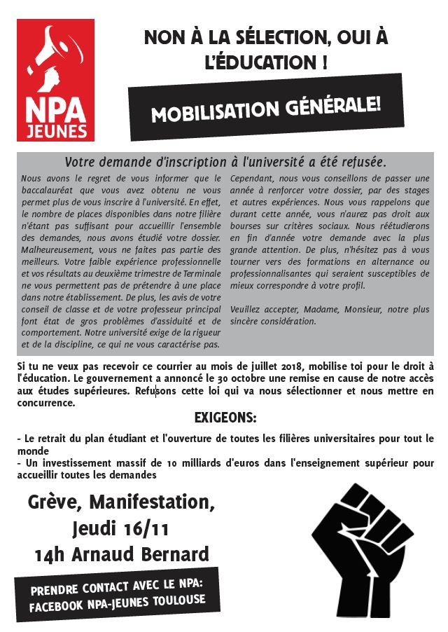 Contre la sélection à l’Université et la réforme du lycée, toutes et tous dans la rue le 16 novembre