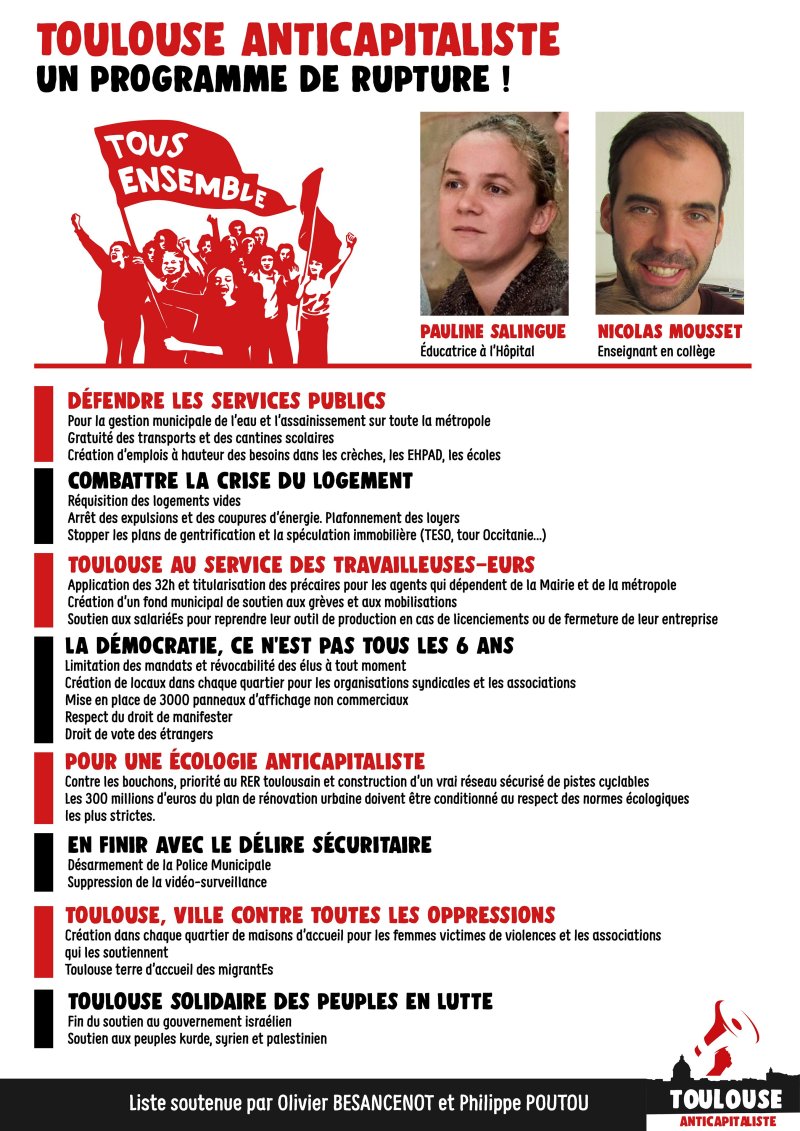 30 janvier 2020Dans ces élections, Toulouse Anticapitaliste défendra un programme de rupture anticapitaliste. Toulouse Anticapitaliste, ce sont 69 candidatEs qui porteront ce programme. La liste sera conduite par Pauline Salingue, animatrice du mouvement social toulousain, investie dans les combats pour la défense de l’hôpital public. Deuxième de liste, Nicolas Mousset est enseignant et acteur des mobilisations dans l’éducation nationale.