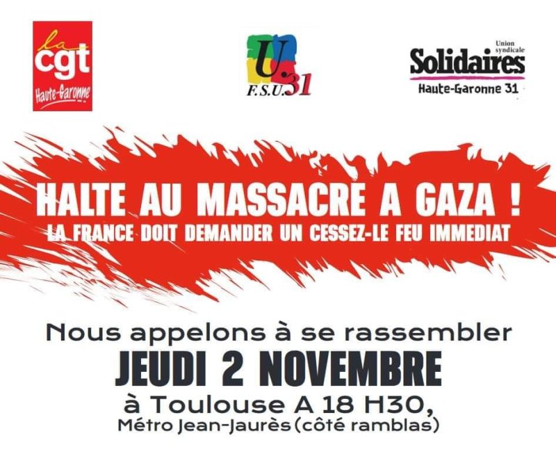 Ce jeudi 2 novembre, ce sont les syndicats CGT, FSU et Solidaires qui appellent à manifester contre les massacres à Gaza et pour un cessez le feu immédiat.