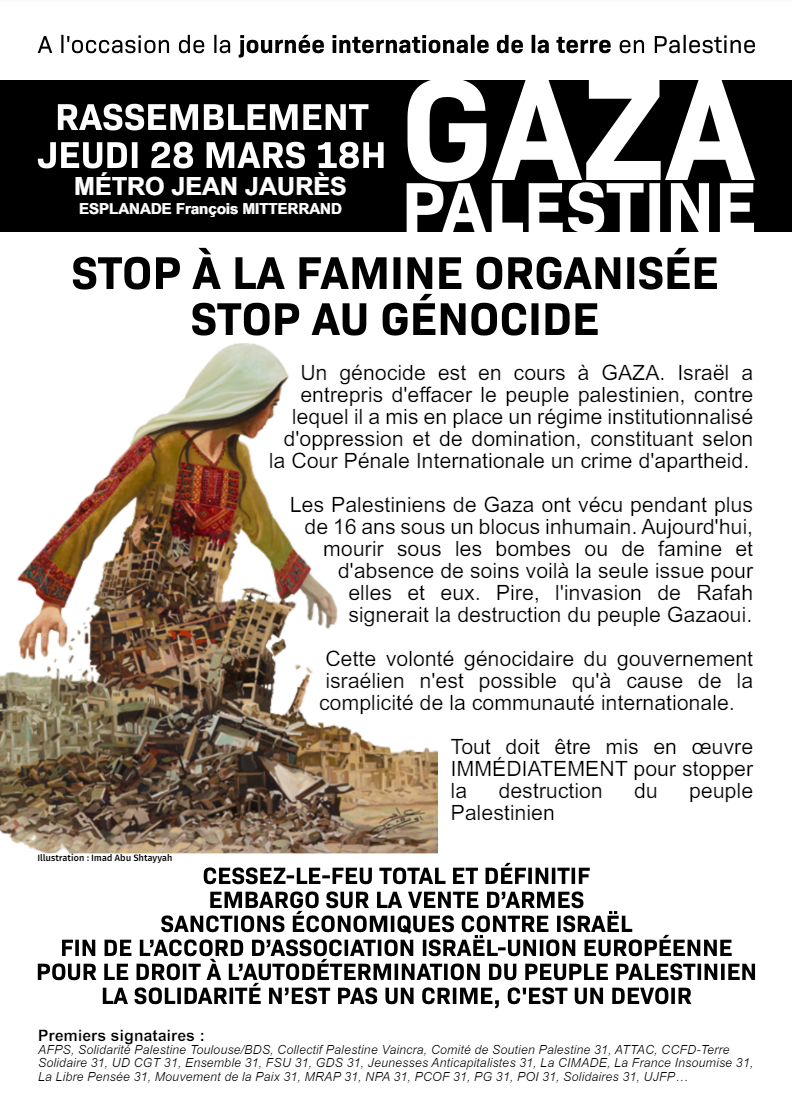AFPS, Solidarité Palestine Toulouse/BDS, Collectif Palestine Vaincra, Comité de Soutien Palestine 31, ATTAC, CCFD-Terre Solidaire 31, UD CGT 31, Ensemble 31, FSU 31, GDS 31, Jeunesses Anticapitalistes 31, La CIMADE, La France Insoumise 31, La Libre Pensée 31, Mouvement de la Paix 31, MRAP 31, NPA 31, PCOF 31, PG 31, POI 31, Solidaires 31, UJFP…