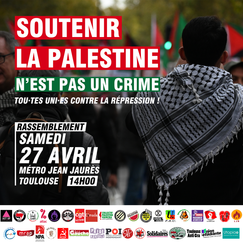Ces attaques contre les soutiens au peuple palestinien doivent être comprises comme des atteintes à nos libertés fondamentales, en particulier la liberté d’expression et d’association. Face à cette situation, nous avons la responsabilité de développer la solidarité avec le peuple palestinien pour mettre un terme au génocide en cours à Gaza et d’être uni·es contre la répression. En ce sens, les organisations de Toulouse appellent à se rassembler samedi 27 avril à 14h à la sortie du métro Jean Jaurès.