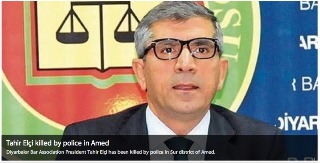 Ce matin, samedi 28 novembre, deux policiers turcs ont assassiné d’une balle dans la tête, Tahir Elçi, prenant pour cible un groupe d’avocats et de journalistes rassemblés à Sur, district de Diyarbakir (Amed en kurde). Avocat, bâtonnier du parquet de Diyarbakir, Tahir Elçi était un défenseur respecté des droits humains, parmi lesquels le droit du peuple kurde à son autodétermination. Il était dans le collimateur du gouvernement de l’AKP, qui l’avait traîné en justice pour avoir déclaré que le « PKK [Parti des Travailleurs du Kurdistan] n’est pas une organisation terroriste » lors d’une émission télévisée de CNN Türk en octobre dernier.