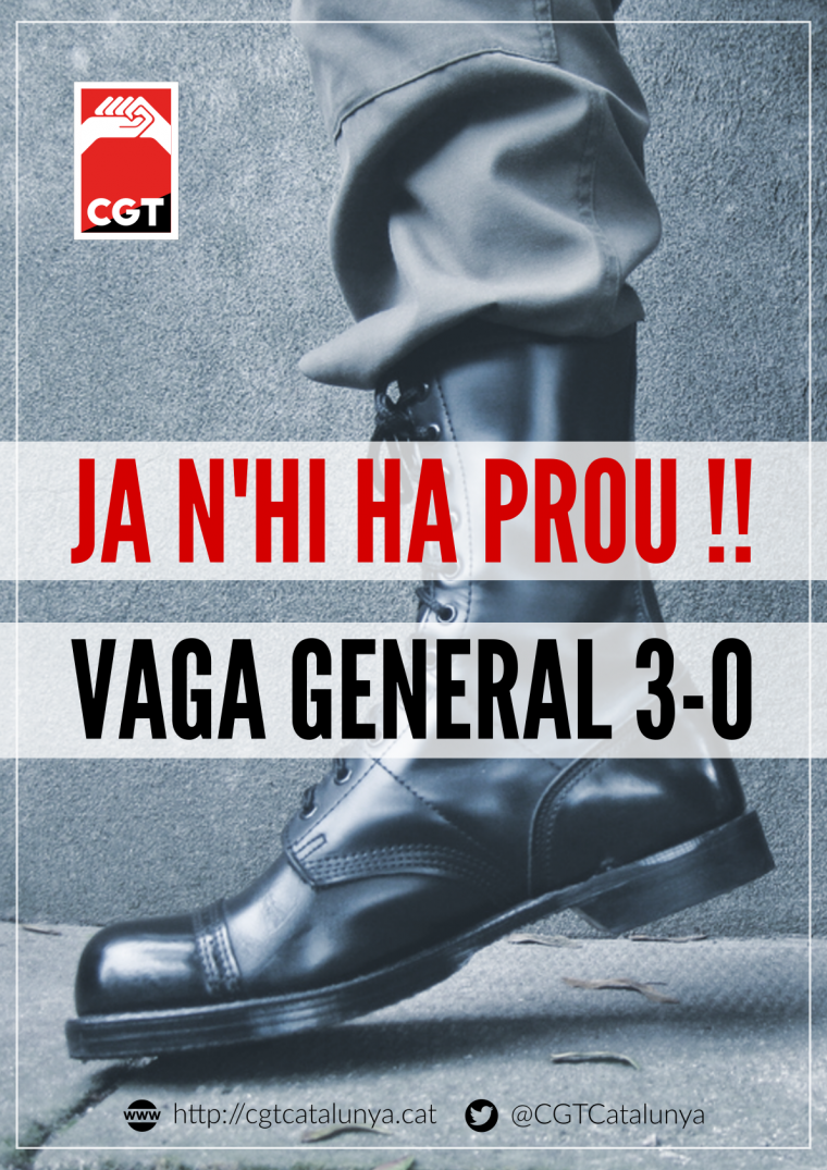 Aujourd’hui, le peuple qui lutte pour ses droits fait la grève générale, un droit gagné par la classe ouvrière, qui agit pour la défense de nos intérêts et de nos droits. En dépit de l’intoxication des soi-disant « syndicats majoritaires », le peuple catalan ira en masse dans les rues pour de nombreuses raisons : la défense des emplois promue dans les appels syndicaux et aussi contre la férule militaire qui a versé notre sang dans les écoles où étudient nos fils et et nos filles.