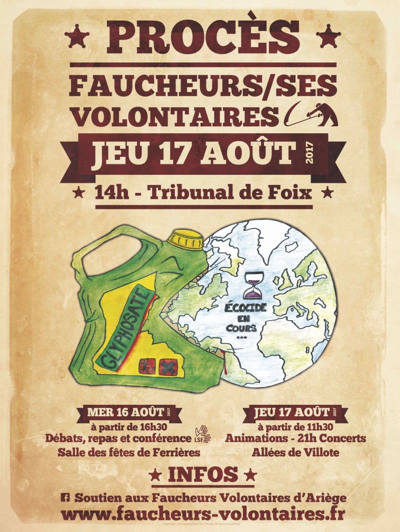 4 septembre 2017Ce jeudi 17 août 2017, à Foix, le procès des Faucheuses et Faucheurs Volontaires qui devait juger 21 prévenu-e-s sur des faits de droit commun (avoir rendu impropres à la vente des bidons de pesticides), va devenir, grâce à la demande de Me Thumerelle, l’avocat et au soutien inattendu de la procureure, un procès sur le fond, sur la toxicité de ces produits et leur éventuelle interdiction, et ce, devant la Cour européenne de justice à Bruxelles !