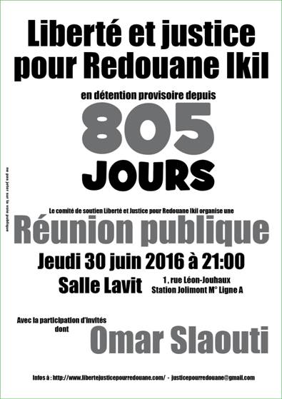 Le comité de soutien Liberté et Justice pour Redouane Ikil organise le 30 juin 2016 une réunion publique à la salle Lavit (M° Jolimont), en présence d’invités dont Omar Slaouti.