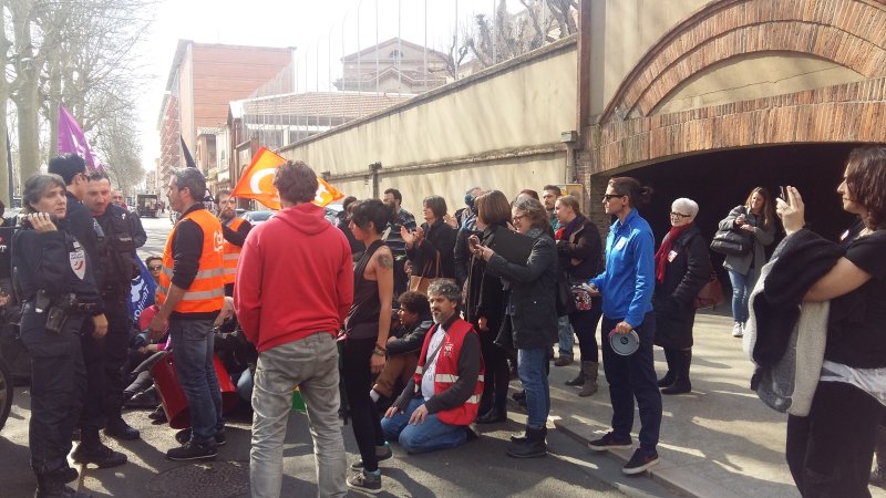 Le 9 mars, les grévistes de la Ligue de l’enseignement se sont rassemblés avec les employé-e-s grévistes du BTP qui luttent contre la liquidation frauduleuse de la Société du Bâtiment Toulousain.