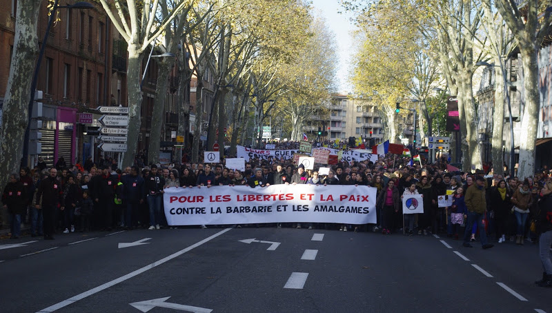 La banderole de tête "Contre la barbarie, contre les amalgames, Pour la paix et les libertés démocratiques" était suivie pour une camionnette avec "Quelle connerie la guerre" et la citation de Jaurès sur la nécessité de combattre l’injustice sociale. Notons la présence de mots d’ordre contre l’État d’urgence, mais surtout la mobilisation active de résistant-e-s au terrorisme avec un cortège kurde munie d’une banderole « Marche mondiale contre Daesh, pour Kobane et l’Humanité » et un cortège du DAL composé d’une cinquantaine de réfugié-e-s syriens derrière une banderole « Refugié-e-s, migrant-e-s, expulsé-e-s, solidarité ». Il y avait également un cortège "musulman" avec des panneaux pour démarquer l’Islam des terroristes.