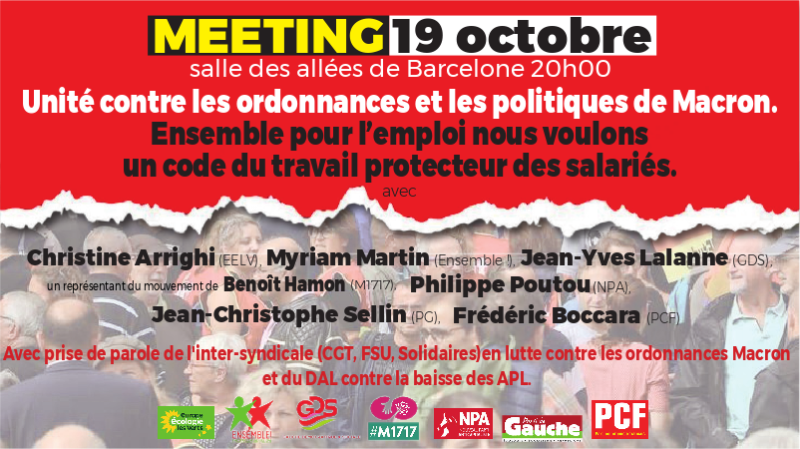 À la suite de plusieurs rencontres depuis cet été des partis politiques de gauche opposées aux ordonnances Macron. 7 organisations (EELV, Ensemble !, GDS, M1717, NPA, PCF et PG) organisent un meeting unitaire le 19 octobre à 20 h salle des allées de Barcelone à Toulouse sous le titre "Unité contre les ordonnances Macron et ses politiques". Prendrons la parole des porte-parole de nos organisations respectives :